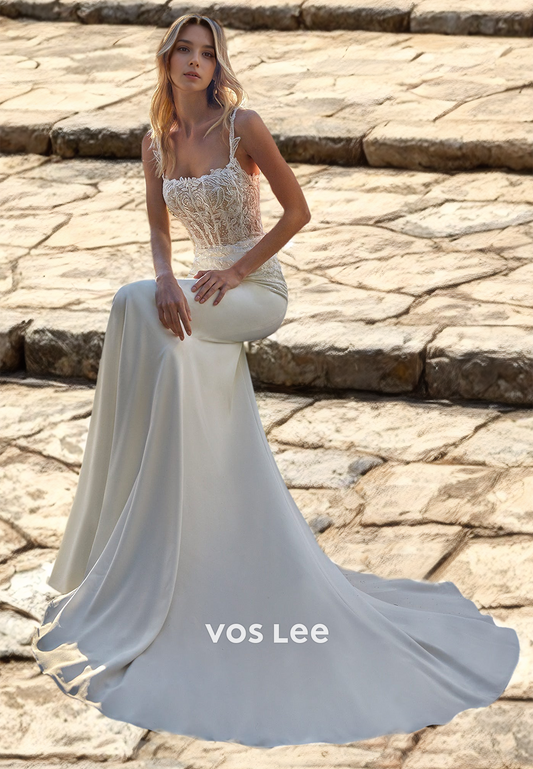 Simple Mermaid Spaghetti Straps Square Neck Column Lace Appliques Draped Wedding Dress