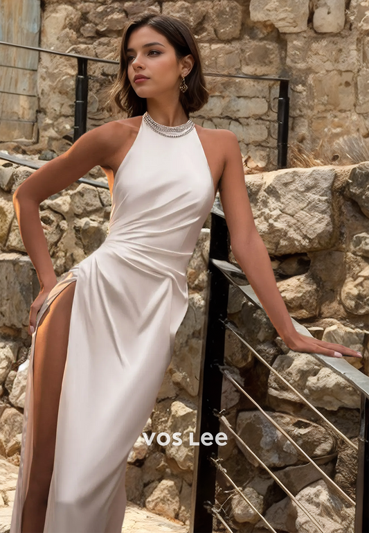 Simple Halter Column Lace Up Sleeveless Sweep Train Ruched Satin Wedding Dress with Split