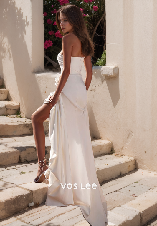 Simple Sheath Strapless Sweep Train Ruched 3D Flower Back Zipper Satin Wedding Dress