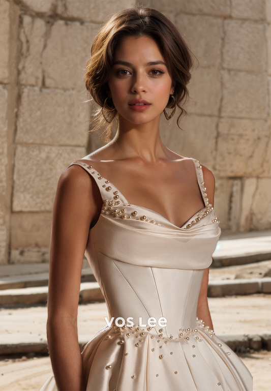 Luxury V Neck A-Line Spaghetti Straps Sleeveless Zipper Beaded Pleated Satin Wedding Gown