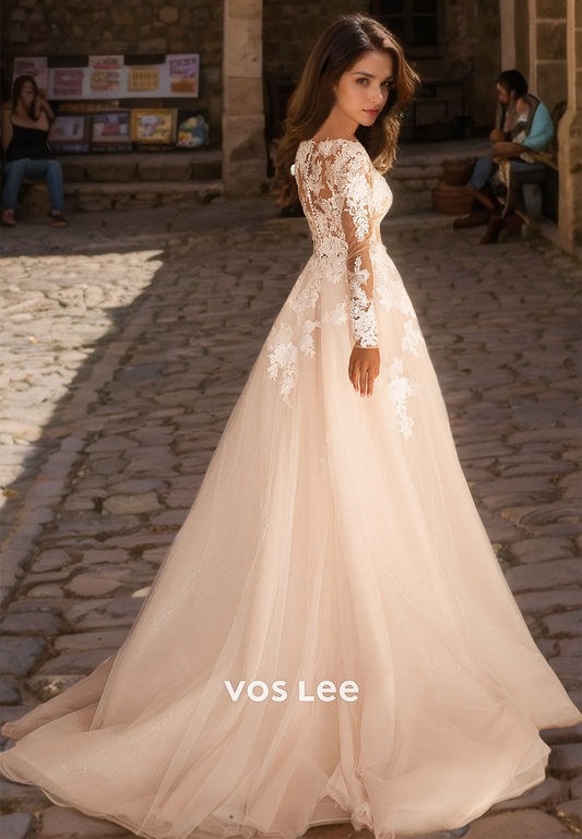 Modest Deep V Neck Illusion A-Line Long Sleeves Beaded Lace Appliques Wedding Bride Dress