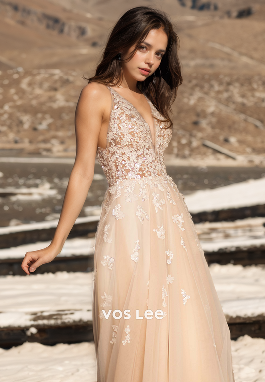 CharmingDeep V Neck Spaghetti Straps Backless A-Line Lace Appliques Tulle Wedding Dress