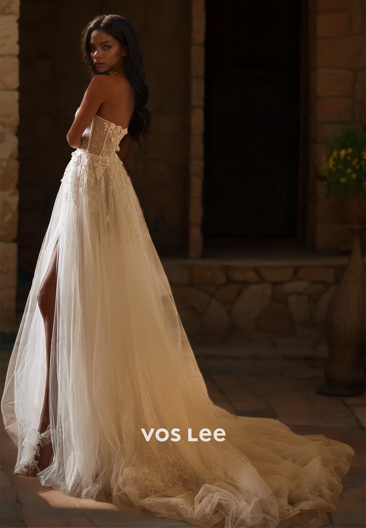 Ornate Sweetheart A-Line Sleeveless High Split Court Train Lace Appliques Wedding Bride Dress