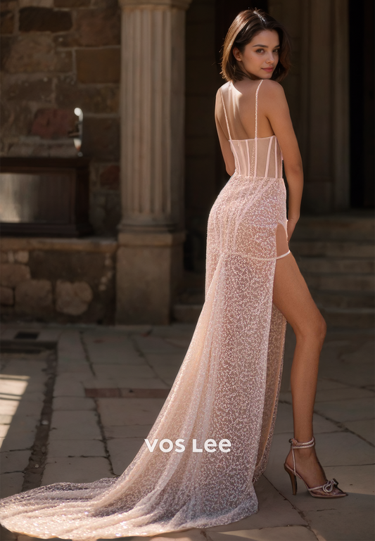 Sexy Sheath Spaghetti Straps V Neck Backless Sequins High Split Sparkly Wedding Bride Dress