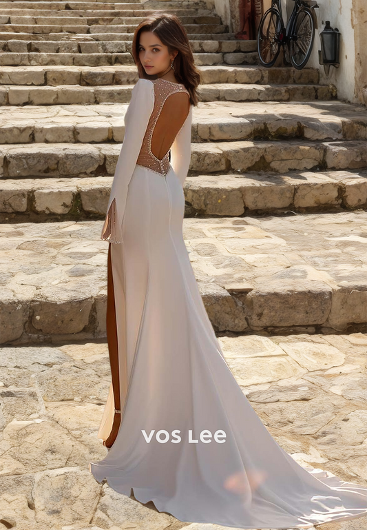 Elegant Sheath Long Sleeves V Neck Beaded High Split Ruched Court Train Wedding Bride Dress