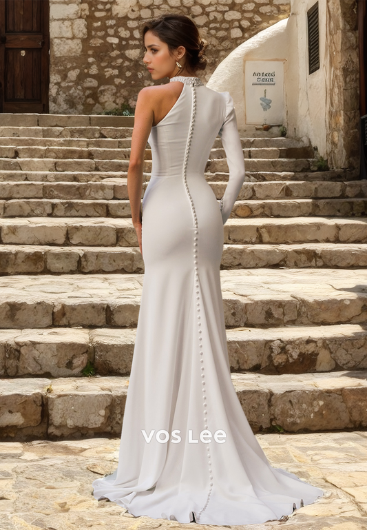 Simple High Neck Beaded Sheath Mermaid Long Sleeves Back Zipper Sweep Train Satin Wedding Dress