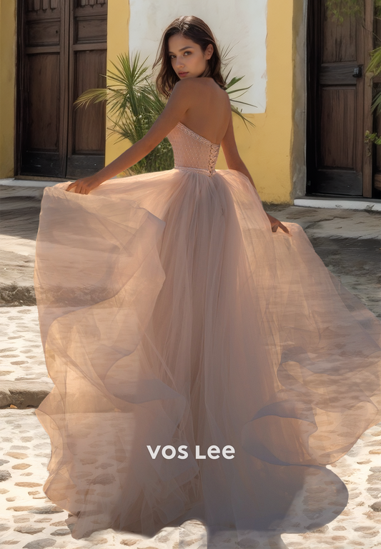 Dreamy Sleeveless A-Line Tube Top Strapless Beaded Court Train Tulle Wedding Bride Dress