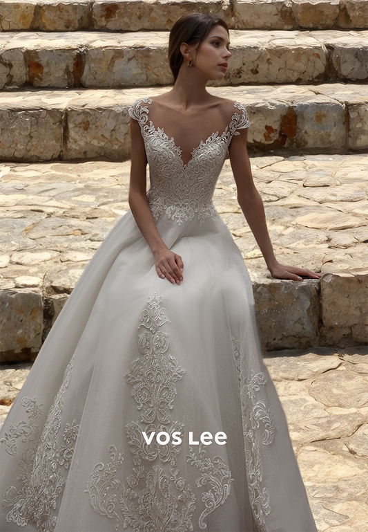 Elegant Plunging V Neck Illusion A-Line Bazk Zipper Cap Sleeves Lace Appliques Tulle Wedding Dress