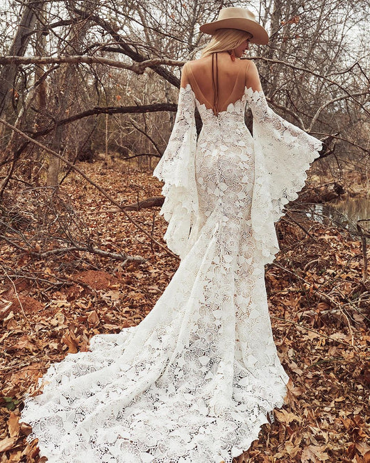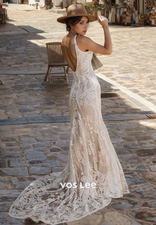 Boho Sheath/Column V-Neck Open Back Lace Wedding Dress with Train