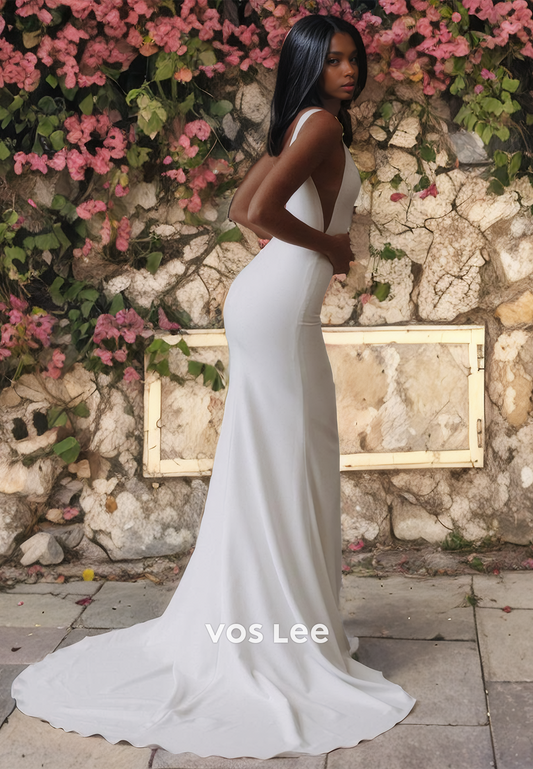 Sheath/Column Low V-Neck Court Train Satin Wedding Dress