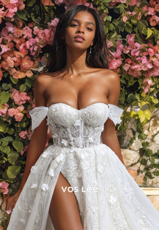 A-Line Off Shoulder Sweetheart Satin Wedding Dress with High Slit and Appliques