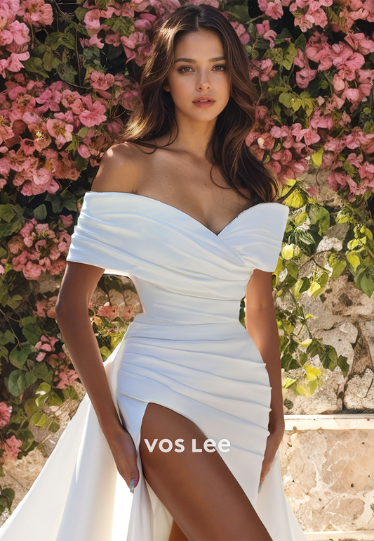 Sheath/Column Off Shoulder Chapel Train Pleated Satin Wedding Dress with High Slit