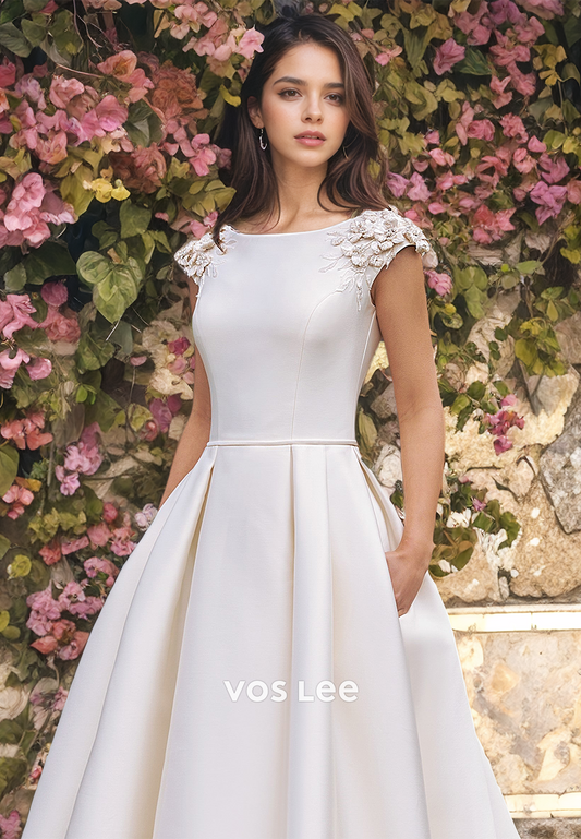 A-Line Square Open Back Chapel Train Satin Wedding Dress with Bow and pockets