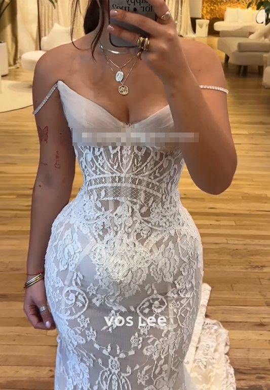 Couture Off the Shoulder Appliques Lace Mermaid Wedding Dresses with Sweep Train