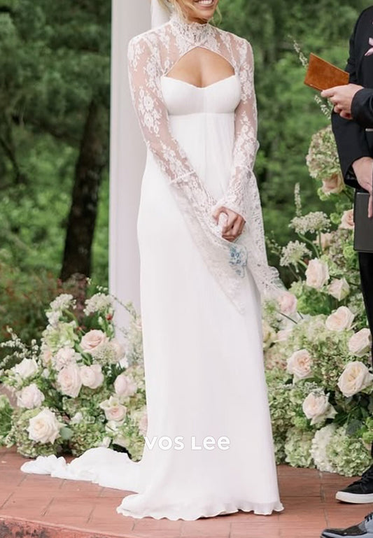 Long Sleeve High Neck Appliques Lace Pleated Sheath Wedding Dresses