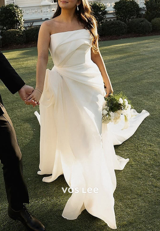Sexy A-Line Strapless V Neck Pleated Wedding Dresses with Chapel Train
