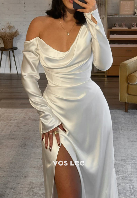 Long Sleeve One Shoulder Satin Pleated Wedding Dresses with High Split