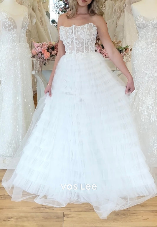 A-Line Strapless Scoop Appliques Lace Tiered Wedding Dresses