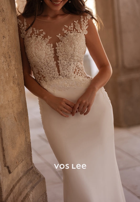 Illusion Neck Beaded Appliques Lace Mermaid Wedding Dresses with Sweep Train