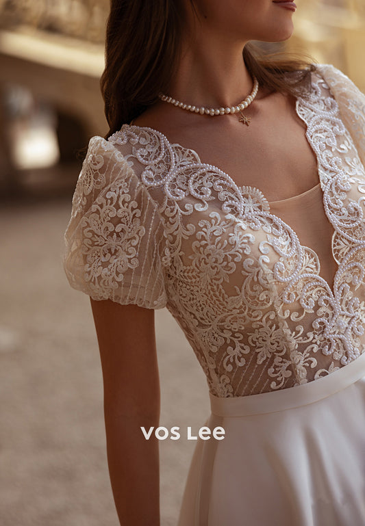 Short Sleeve V Neck A-Line Appliques Lace Wedding Dresses with Court Train