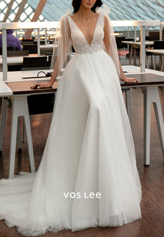 A-Line V Neck Rhinestone Tulle Wedding Dresses with Court Train