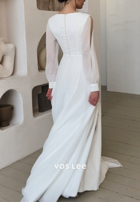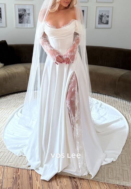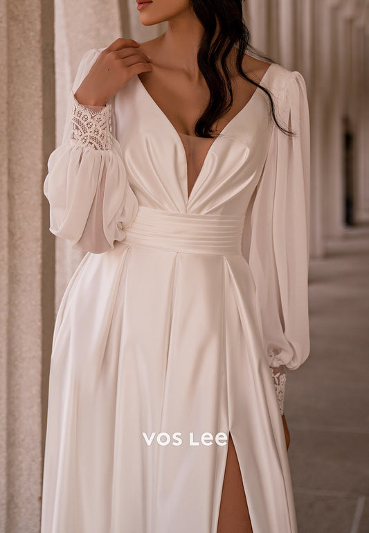 A-Line Long Sleeve V Neck Satin Wedding Dresses with Side Split