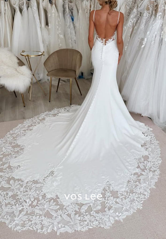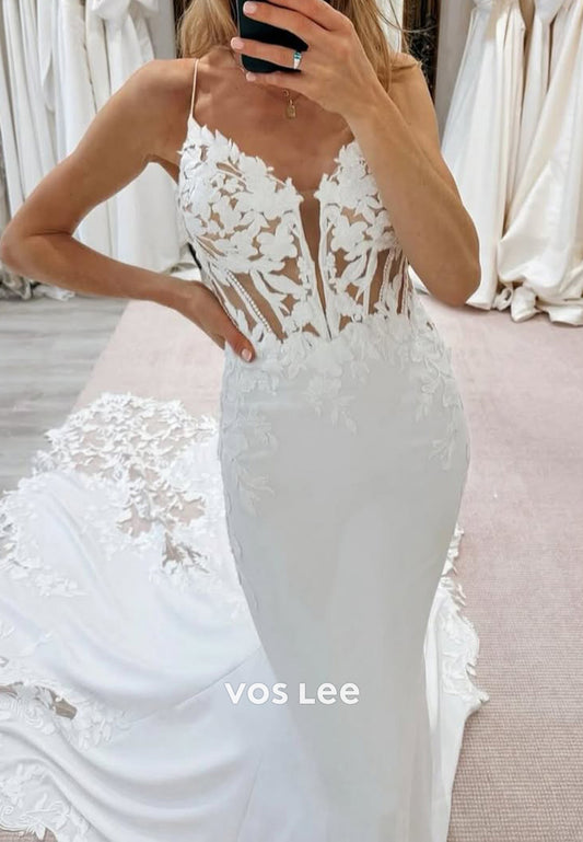 Spaghetti Straps V Neck Appliques Lace Mermaid Wedding Dresses with Sweep Train