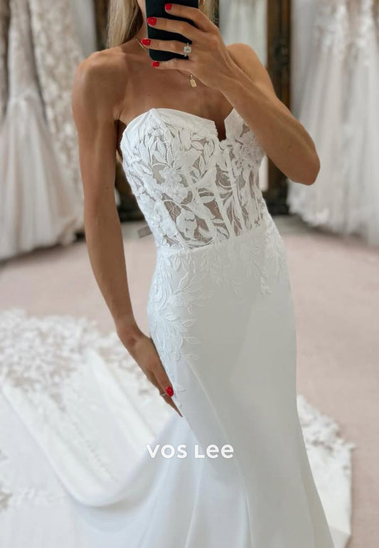 Strapless Sweetheart Lace Appliques Mermaid Wedding Dresses with Court Train