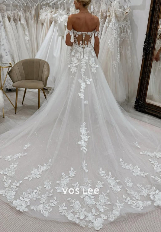 A-Line Off the Shoulder Appliques Lace Tulle Wedding Dresses with Chapel Train