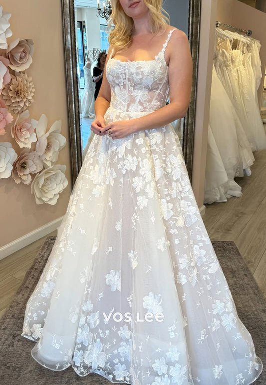 A-Line Spaghetti Straps Appliques Lace Floor-Length Wedding Dresses