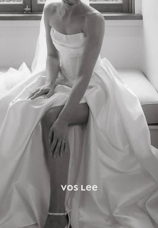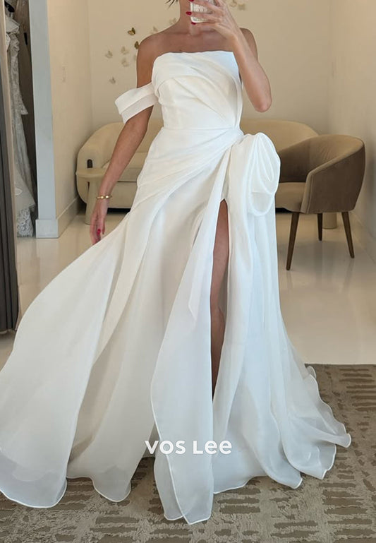 A-Line Strapless Scoop Pleated Wedding Dresses with High Split