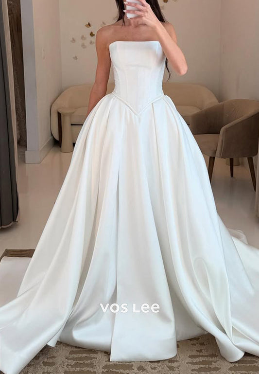 Simple A-Line Strapless Sweetheart Wedding Dresses with Court Train