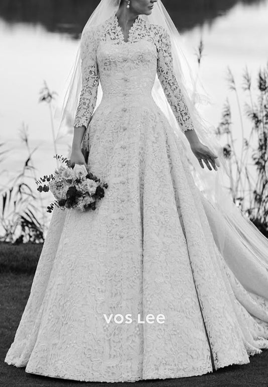A-Line V Neck 3/4 Sleeve Lace Appliques Wedding Dresses with Chapel Train