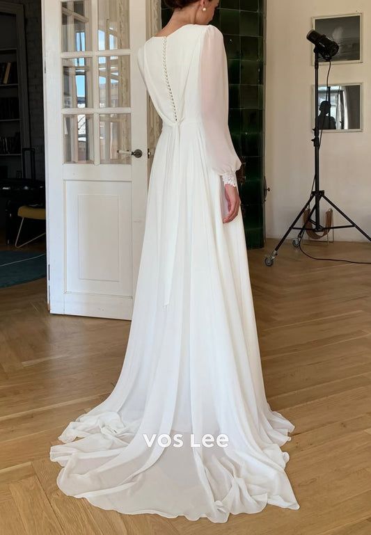 A-Line Long Sleeve V Neck Pleated Wedding Dresses with High Split