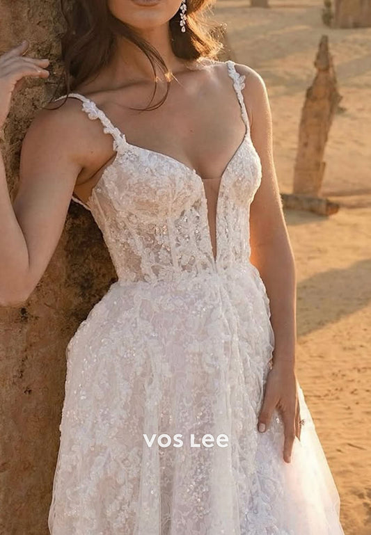Spaghetti Straps V Neck A-Line Lace Appliques Wedding Dresses with Court Train