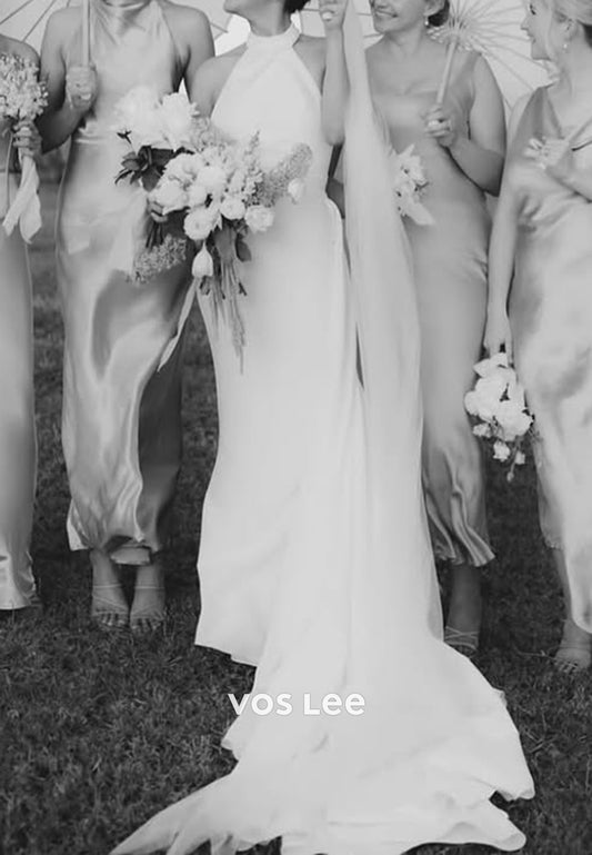 Simple & Classic Halter Satin Mermaid Wedding Dresses with Court Train