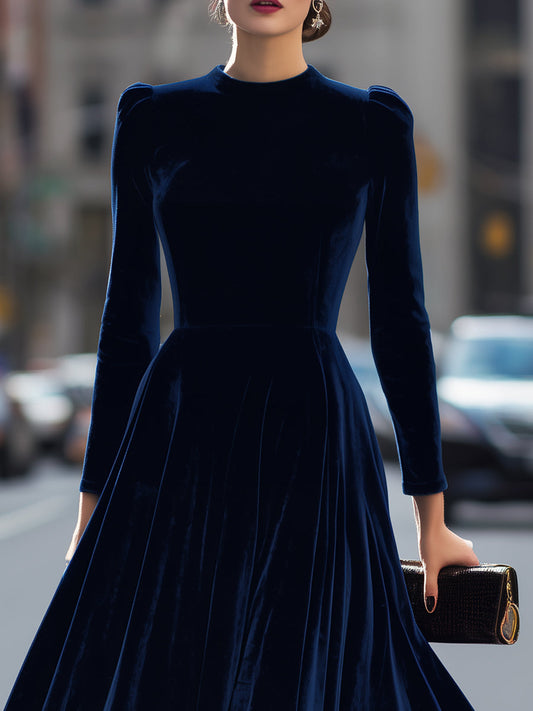 Luxurious Navy Blue Velvet Long-Sleeve Midi Dress