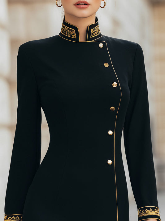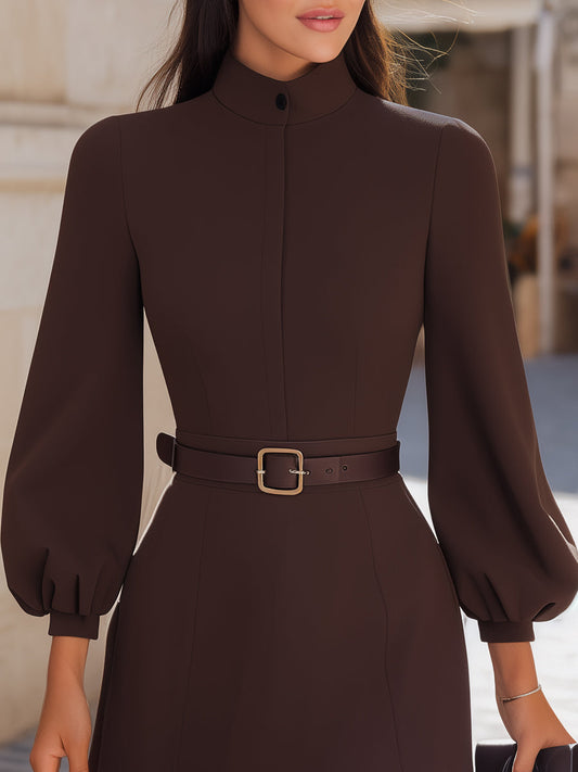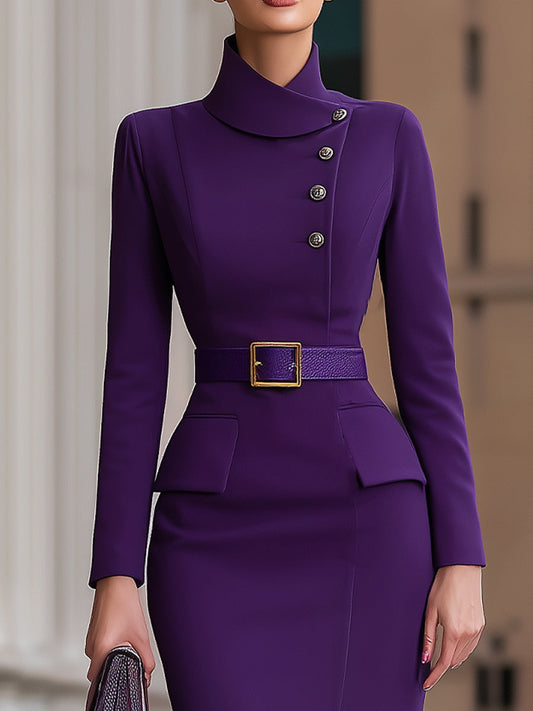 Elegant High-Neck Belted Midi Dress With Asymmetric Button Detail
