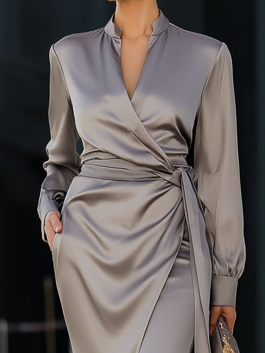 Navy Blue Satin High Neck Long Sleeve Maxi Dress