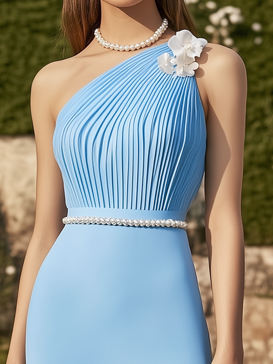 Elegant 3D Flower Detail Pleated One-Shoulder Floral Print Dress With Pearl Belt