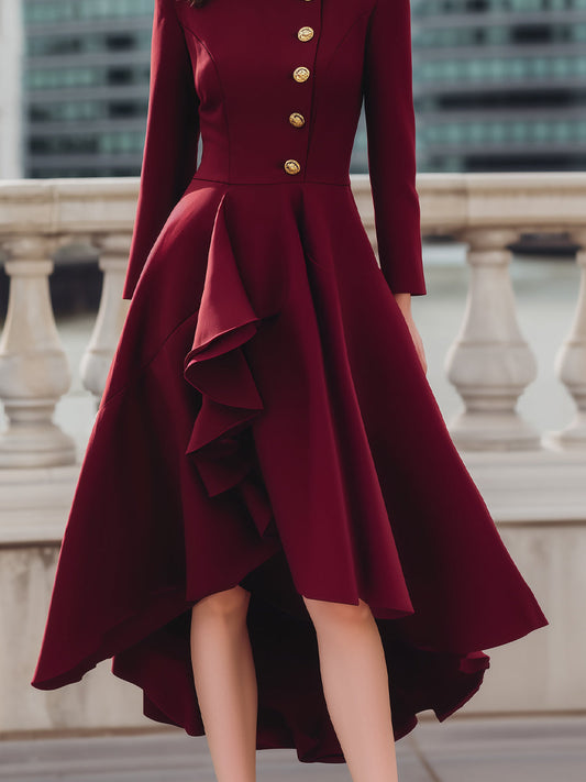 Structured Asymmetrical Ruffle Hem Dress With Gold Buttons