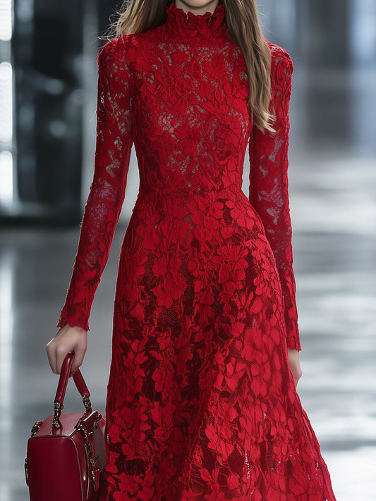 Crochet Turtleneck Midi Dress With Lining And Belt