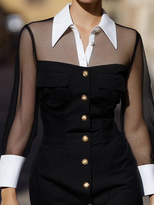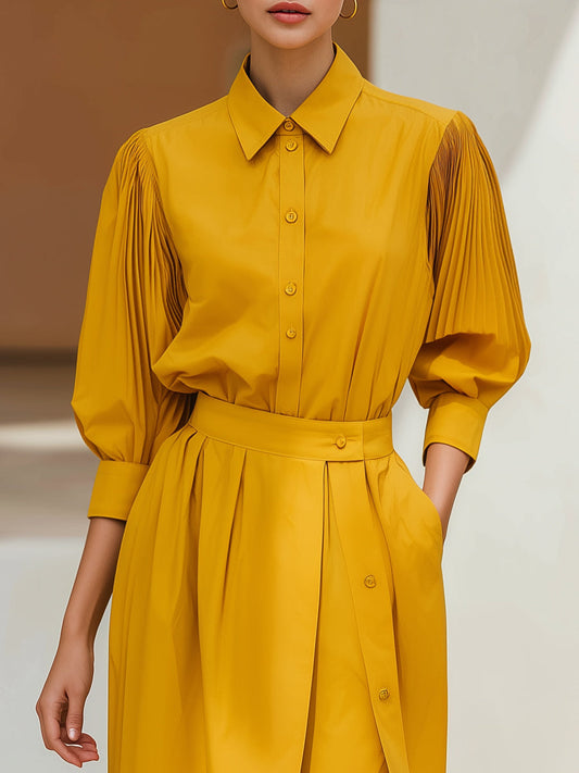 Faux-Two-Piece Skirt Pleated Sleeves Shirt Dress