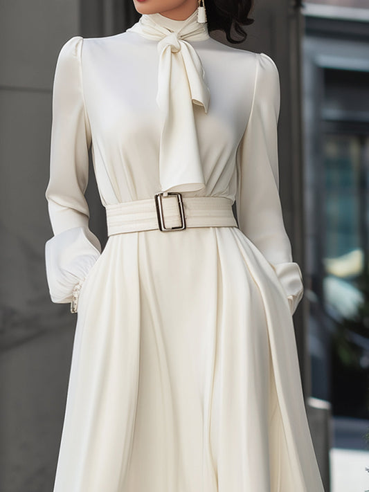 Ivory Ruffle Hem Belted Midi Dress With Bow Tie Neck