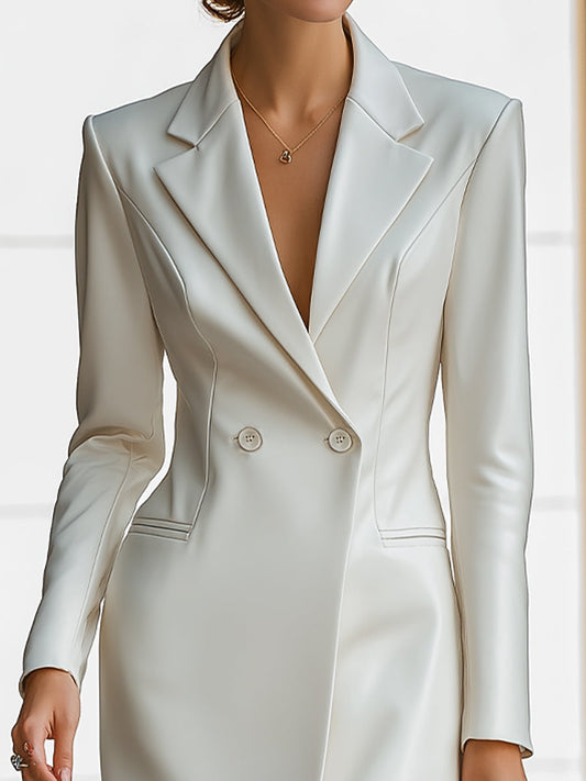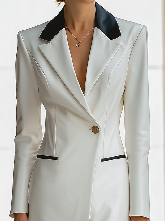 Elegant Faux Leather Tuxedo-Inspired Blazer Dress With Black Lapels