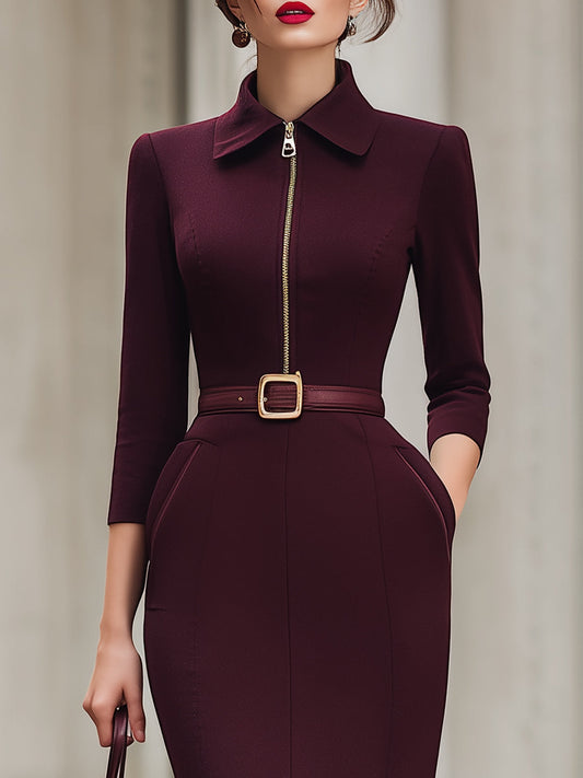 Elegant Burgundy Belted Midi Dress With Zipper Detail