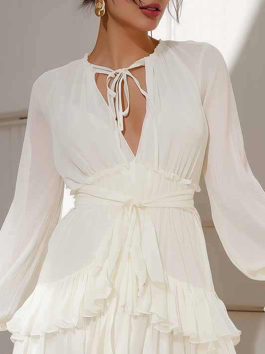 VOS LEE Elegant V-Neck Ruffled Chiffon Dress In Sunshine Yellow