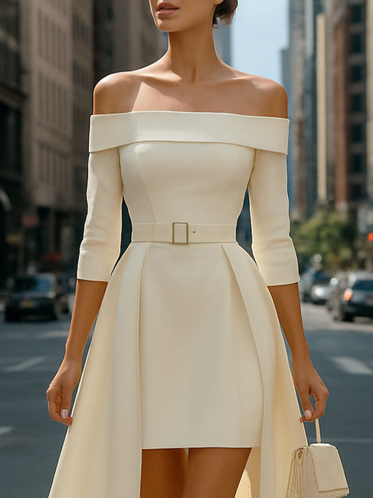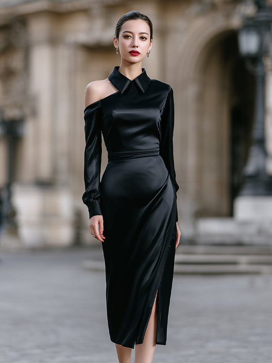 Elegant Satin Asymmetric Cold Shoulder Midi Dress