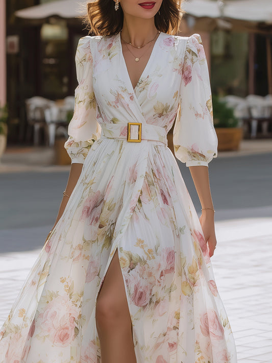 Romantic Floral Chiffon Maxi Dress With Belted Waist