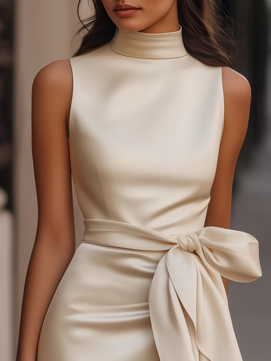 Satin Sleeveless Mini Dress With Ruffles And Bow Detail